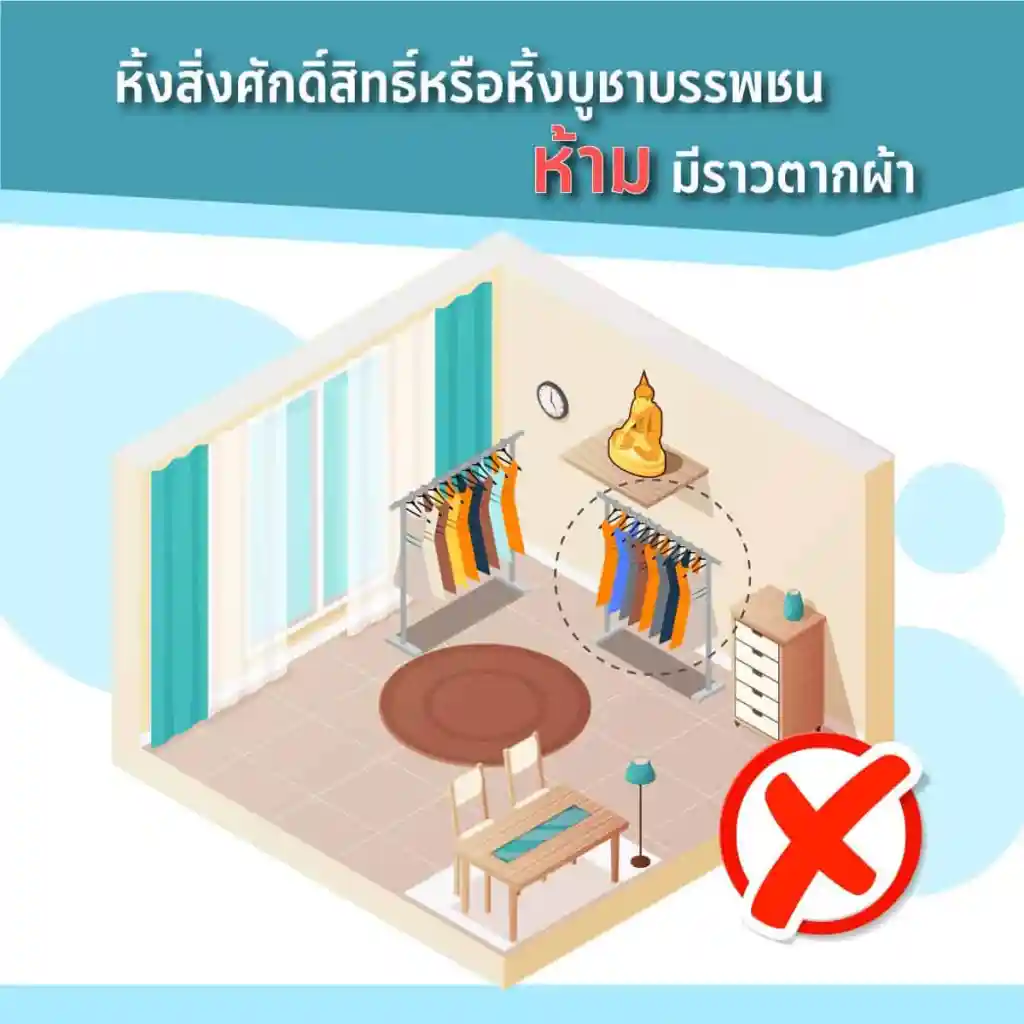 ห้ามตากเสื้อผ้าหน้าสิ่งศักดิ์สิทธิ์หรือหิ้งบูชาบรรพชน เพราะเสื้อผ้ามีตั้งแต่เสื้อธรรมดาไปถึงชุดชั้นในและมาตากเสื้อผ้าหน้าสิ่งศักดิ์สิทธิ์ ทำให้พลังของสิ่งศักดิ์สิทธิ์ไม่สามารถปกป้องคนในบ้านได้ และเป็นการแสดงความไม่เคารพอีกด้วยส่งผลให้การงานโชคลาภติดขัด