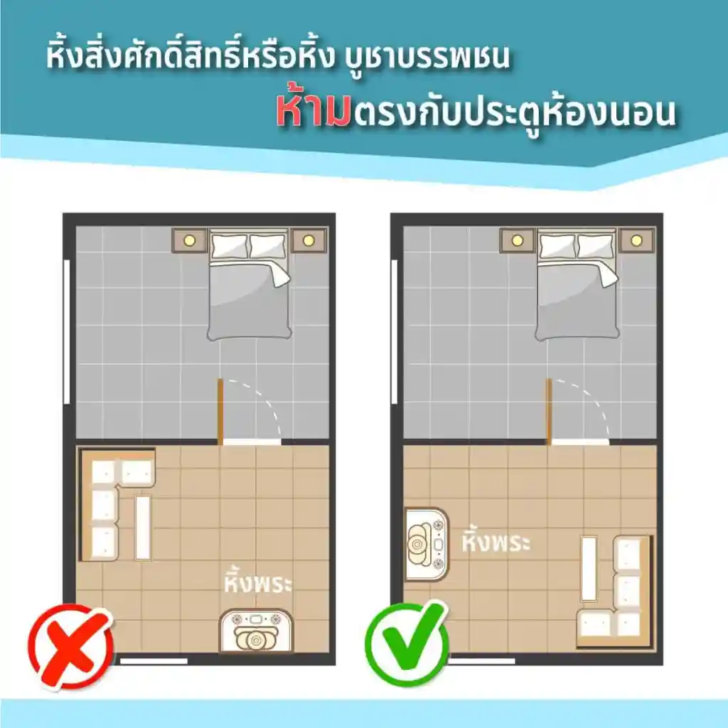 เราไม่ควรวางสิ่งศักดิ์สิทธิ์หรือหิ้งบูชาบรรพชนไว้ตรงหน้าประตูห้องนอน เพราะเป็นการแสดงความไม่เคารพ โดยเฉพาะอย่างยิ่งเมื่อต้องแต่งชุดนอนเดินผ่านหน้าสิ่งศักดิ์สิทธิ์ไปมา มีผลทำให้ โชคลาภติดขัด