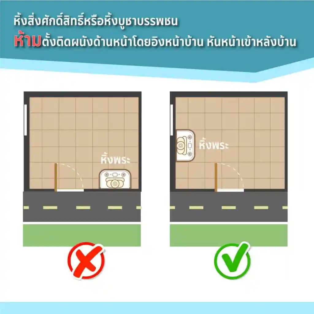 4. หิ้งสิ่งศักดิ์สิทธิ์หรือหิ้งบูชาบรรพชน ห้ามตั้งติดผนังด้านหน้าโดยอิงหน้าบ้าน หันหน้าเข้าหลังบ้าน